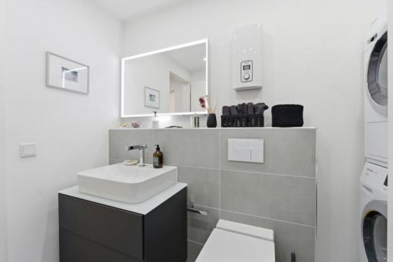 Auch das Badezimmer wurde vollständig neu gestaltet und präsentiert sich modern und elegant mit bodengleicher Grohe-Regendusche, Sanitärobjekten von Villeroy & Boch, beleuchteten Badmöbeln, dimmbarem Spiegel mit integrierter Spiegelheizung sowie Waschmaschinenanschluss.