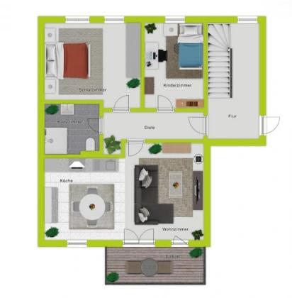 Auf 81 m² Wohnfläche erwartet Sie ein großzügiger Wohn- und Essbereich mit offener Küche als zentraler Lebensmittelpunkt. Die bodentiefen Fenster sorgen für viel Tageslicht und schaffen eine angenehme Wohnatmosphäre. Von hier aus gelangen Sie direkt auf den Balkon, der zusätzlichen Freiraum bietet und zum Entspannen im Freien einlädt.