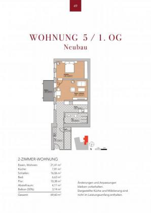 Diese ansprechende und moderne Neubau-Wohnung (Nr. 5) wird Sie begeistern! Sie befindet sich im neuerbauten Dachgeschoss eines stilvollen, ursprünglich im Jahr 1846 als Königliches Amtsgericht erbautem, Gebäudes und wird in wenigen Monaten fertiggestellt. Die Wohnung ist sowohl über einen Fahrstuhl als auch über das Treppenhaus zu erreichen. Auf ca. 69,60 m² Wohnfläche befindet sich ein offener und einladender Wohn- und Essbereich mit Küche und Zugang zum Balkon, ein Schlafzimmer, ein Abstellraum sowie ein Bad. Zu der Wohnung gehören weiterhin ein eigener Kellerraum. Gestaltet werden die Wohnungen im modernen Design, vereint mit einem gewissen Landhauscharme durch beispielsweise Echtholzparkett. Beheizt wird diese Wohnung mit einer Luftwärmepumpe. Unterstützend hierzu steht eine Gasheizung zur Verfügung. Fußbodenheizung wird Teil der Ausstattung sein und sorgt für ein angenehmes Raumklima und niedrige Energiekosten. Zu diesem Objekt liegt uns ein Energiebedarfsausweis vom 09.10.2025, gültig bis zum 08.10.2035 vor. Der Energiebedarf ist mit 32,8 kWh/(m²*a) angegeben, die entspricht der Effizienzklasse A.