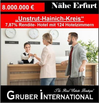 Das von Gruber International angebotene Hotel ist mit einer Rendite von ca. 7,785% eine sehr gute Kapitalanlage für Hotel-Investoren. Das Hotel Garni verfügt über 124 Hotelzimmern befindet sich in sehr guter Lage des Unstrut-Hainich-Kreises. Die Nähe zur Landeshauptstadt Erfurt und deren Attraktionen, sowie der Flughafen Erfurt-Weimar und die zahlreichen neuen Gewerbegebiete sorgen für eine sehr gute Auslastung des Hotels. Das Hotel wird seit einigen Jahren sehr erfolgreich von einer erfahrenen Hotel-Betreibergesellschaft geführt. Die klassisch eingerichteten Zimmer im HOTEL verfügen alle über einen Flachbild-Sat-TV sowie ein eigenes Bad mit einem Haartrockner und natürlich auch ein kostenfreies WLAN. Im Hotel gibt es auch verschiedenen Räumen für kleine Tagungen und Versammlungen. Die Tagungsräume variieren in der Größe von ca. 70 qm bis 250 qm und können je nach Tischform ca. 15 bis 100 Personen aufnehmen. Alle Räume haben Tageslicht und können verdunkelt werden. Sie beinhalten Flipchart, Pinnwand, Beamer, Leinwand, Fernseher, WLAN und einen Moderatorenkoffer.