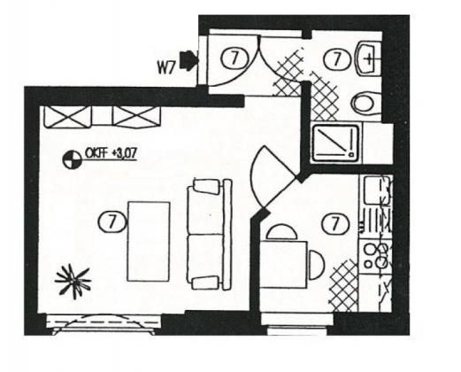 Die zur Miete angebotene Wohnung mit ca. 24,20 m² Wohnfläche befindet sich im 1. OG und besitzt folgende Ausstattung: