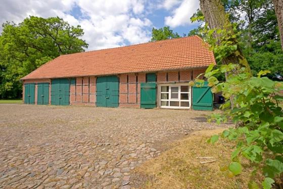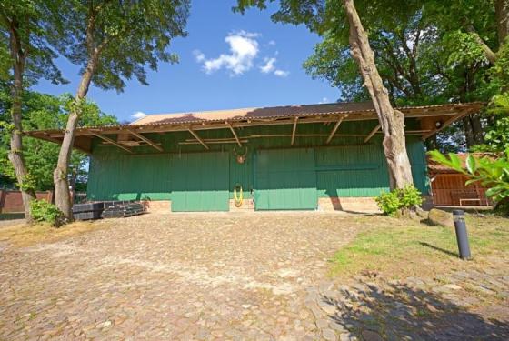 Besonderes Entwicklungspotenzial bietet die massive Remise: Sie umfasst mehrere Garagen, eine Werkstatt und große Lagerflächen. Ein positiver Bauvorbescheid erlaubt die Umnutzung dieses Gebäudes zu Pferdestallungen und/oder einer Tierklinik. Zusätzlich besteht die Genehmigung zum Bau von zwei Appartments für Betriebsleiter oder Personal – ideale Nutzungsmöglichkeiten für zukünftige professionelle Nutzungskonzepte.