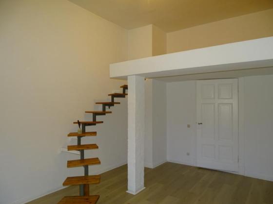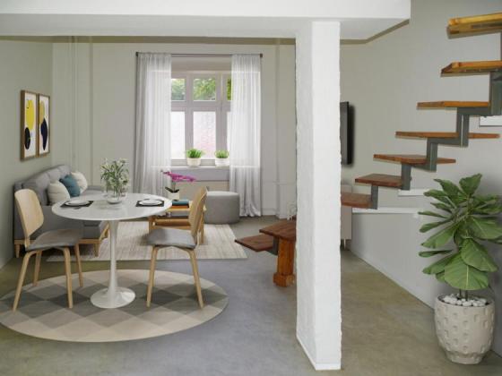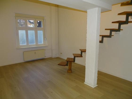 Die Wohnung befindet sich im Erdgeschoss und überzeugt durch eine praktische Aufteilung. Der Wohnraum ist offen gestaltet und verfügt über eine eingebaute Hochebene, die sich ideal als Schlafbereich nutzen lässt. Eine separate Küche mit Fenster sowie ein innenliegendes Badezimmer mit Badewanne runden das Angebot ab.