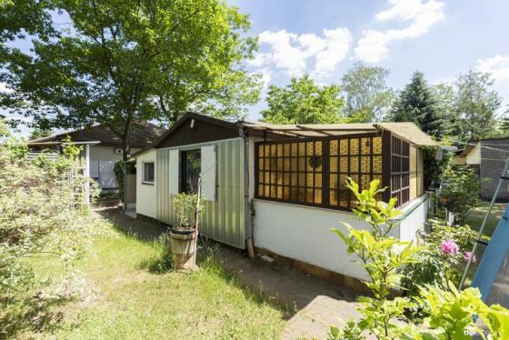 Aktuell ist das als Bauland ausgewiesene Flurstück ca. 759 m² groß und kann, nach dem Abriss der Gartenlauben und der Beräumung des Grundstückes, direkt bebaut werden. Der Schuppen kann nach Reparatur der Tür weiter genutzt werden, da er recht solide gebaut ist.