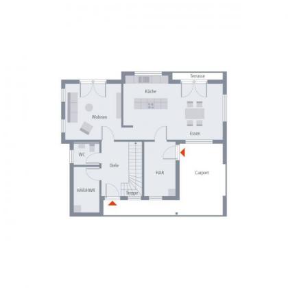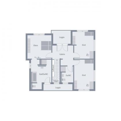 Die klare Struktur der zweigeschossigen Flachdachvilla wird durch die Rücksprünge in der Fassade und die asymmetrische Gestaltung architektonisch bereichert. Praktisch und ideal für kleinere Grundstücke ist der integrierte Carport. Auch im Innenbereich setzt sich der schlichte, helle und komfortable Stil fort. Das Erdgeschoss ist deutlich in Nutz-, Wohn- und Essbereich mit offener Küche unterteilt. Eine halbgewendelte Treppe führt zur oberen Etage. Dort befindet sich das Elternschlafzimmer mit einem großzügigen Bad sowie Zugang zur eigenen Loggia, die vom Bereich der Kinder mit Dusche/WC abgetrennt ist. Die verschiedenen Bereiche werden durch die lichtdurchflutete Galerie verbunden, die ebenfalls zu einer weiteren Loggia führt. Hier fühlt man sich rundum wohl.