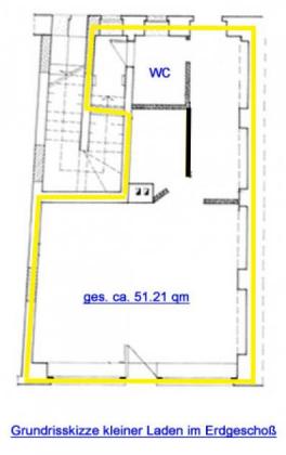 Dieses Ladenlokal, mit ca. 51,52 qm Gesamtmietfläche, befindet sich im Erdgeschoss eines Wohn- und Geschäftshauses. Die Ladeneinheit besteht aus zwei Räumen, straßenseitiger Raum mit zwei Schaufenstern und Eingangsbereich, anschließender Raum individuell nutzbar. Weiterhin gehören WC und Abstellraum dazu. Der Sanitärbereich ist mit WC und Handwaschbecken ausgestattet.
