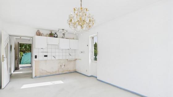 - Wohnzimmer mit offenem Küchenbereich und Zugang zur Terrasse