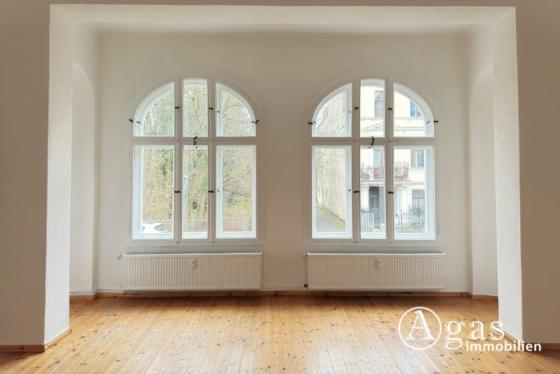 Biegt man vom Flur aus nach rechts ab, gelangt man in das großzügige Wohnzimmer. Der Raum beeindruckt durch seine Größe und die schöne Fensterfront, die viel Licht hereinlässt und den Altbaucharme des Hauses besonders unterstreicht.