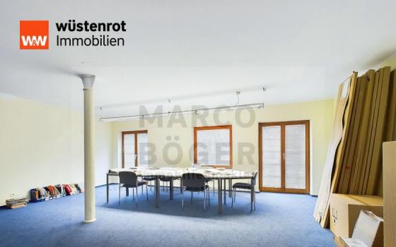 Aufteilung: 1x Büroraum mit Kachelofen, großer Konferenzraum (kann unterteilt werden), mit 2x Schiebetürwandschrank auf dem Flur, Aufenthaltsraum/Mitarbeiterküche mit Küchenzeile, zwei Mitarbeiter-WCs (M/W). Männer-WC mit Vorbereitung einer Dusche.