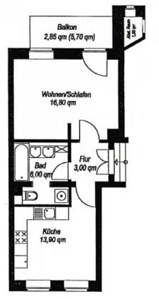 1 Raum Wohnung zum Kauf als Kapitalanlage: vermietet, Erdgeschoss/Hochparterre, Balkon, Badezimmer mit Badewanne, Parkettboden, Keller.