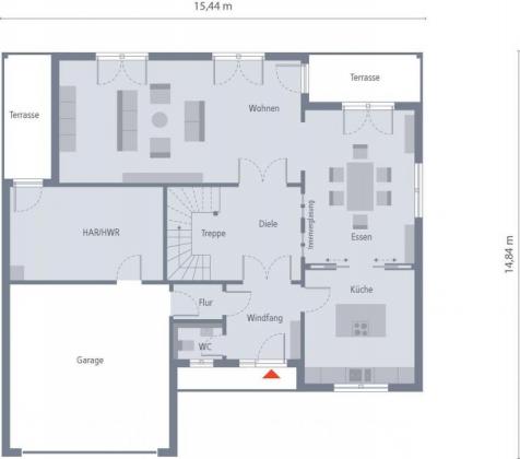 Unter dem formschönen Satteldach punktet dieses Einfamilienhaus mit viel Raum zum Wohlfühlen. Im Erdgeschoss bietet der lichtdurchflutete Wohnbereich mit seinen fast 40 m² ausreichend Platz zum Verweilen in behaglicher Atmosphäre und einen direkten Zugang zur Terrasse. In der geschlossenen Küche können sich Kreative ungestört auf die Zubereitung kulinarischer Köstlichkeiten konzentrieren und in gemütlicher Umgebung des Esszimmers genießen. Vom großen Hauswirtschaftsraum lässt sich die Garage mit zwei Stellplätzen unmittelbar erreichen. Direkt am Eingangsbereich befindet sich ein kleines Gäste-WC, anschließend führt die zentralgelegene Treppe hoch ins Dachgeschoss. Geräumige Wohnfläche, separates Bad mit Dusche und WC, angeschlossene Ankleide und Zugang zur Dachterrasse: im Schlafzimmer sind alle Voraussetzungen für individuelles Wohlbefinden vorhanden. Zwei großzügige Kinderzimmer, ein weiteres Bad mit Wanne, Dusche und WC sowie ein Abstellraum runden den Landhauswohnstil der oberen Etage ab.