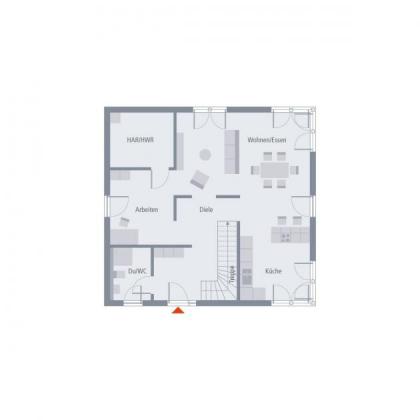 Das rund 90 Quadratmeter große Erdgeschoss besticht bei Design 17 vor allem durch seine Offenheit. Lediglich das mit Dusche und Toilette ausgestattete Gäste-WC, das sich direkt im Eingangsbereich befindet, sowie der sich an das offene Arbeitszimmer anschließende Hauswirtschaftsraum sind durch Wände von den übrigen Zimmern abgetrennt. Fließend gehen alle anderen Räume ineinander über. Diese architektonische Raffinesse suggeriert dem Auge Größe und sorgt zudem dafür, dass jeder Winkel des Hauses - die Diele mit Treppenaufgang eingeschlossen - lichtdurchflutet und hell ist. Ein besonderes Highlight im Erdgeschoss: die fast 14 m² große Küche, die das Herz eines jeden Hobbykochs höher schlagen lässt. Bis ins letzte Detail durchdacht ist auch das Obergeschoss. Vom Flur aus erreichen Sie sowohl die beiden Kinderzimmer als auch das Elternschlafzimmer mit separatem Ankleideraum sowie das rund 12 m² große Bad.