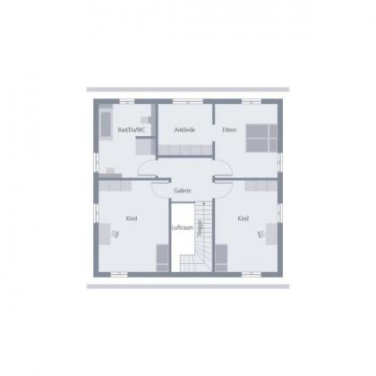 Das rund 90 Quadratmeter große Erdgeschoss besticht bei Design 17 vor allem durch seine Offenheit. Lediglich das mit Dusche und Toilette ausgestattete Gäste-WC, das sich direkt im Eingangsbereich befindet, sowie der sich an das offene Arbeitszimmer anschließende Hauswirtschaftsraum sind durch Wände von den übrigen Zimmern abgetrennt. Fließend gehen alle anderen Räume ineinander über. Diese architektonische Raffinesse suggeriert dem Auge Größe und sorgt zudem dafür, dass jeder Winkel des Hauses - die Diele mit Treppenaufgang eingeschlossen - lichtdurchflutet und hell ist. Ein besonderes Highlight im Erdgeschoss: die fast 14 m² große Küche, die das Herz eines jeden Hobbykochs höher schlagen lässt. Bis ins letzte Detail durchdacht ist auch das Obergeschoss. Vom Flur aus erreichen Sie sowohl die beiden Kinderzimmer als auch das Elternschlafzimmer mit separatem Ankleideraum sowie das rund 12 m² große Bad.