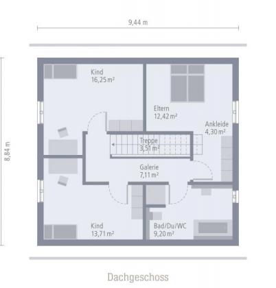 Geschmackvoll, lichtdurchflutet und offen - so lässt sich unser Haus Design 10 charakterisieren. Unter dem zeitlos-eleganten Satteldach laden rund 135 qm Wohnfläche zum Leben, Wohlfühlen und Träumen ein. Die offene Architektur im Erdgeschoss vermittelt ein Gefühl von Weite, ohne dabei an Gemütlichkeit und Behaglichkeit einzubüßen. Dafür sorgt die besondere Raumeinteilung: Die geräumige Diele geht - lediglich getrennt durch einen kleinen Vorsprung - direkt in den Koch- und Ess-Bereich über. Und der besticht nicht nur durch seine Größe, sondern auch durch seine Helligkeit. Dafür sorgen zahlreiche Fenster, die einen direkten Blick in den Garten gewähren. Auch das Wohnzimmer ist unmittelbar von der Diele aus zugänglich und mit seinen knapp 18 qm ein echter Wohlfühlort. Ebenfalls Parterre: Hauswirtschaftsraum sowie Gäste-WC. Über die Diele führt eine gerade Treppe in den Bereich, in dem Erholung und Entspannung im Fokus stehen. Hier befinden sich neben dem Schlafzimmer für die Eltern noch zwei Kinderzimmer sowie ein großes Bad. So geht stilvoll wohnen.