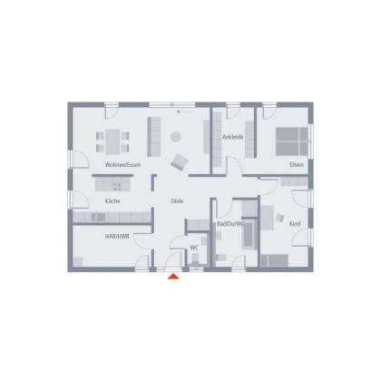 Unser Bungalow 1 Walmdach bietet auf einer Wohnfläche von 107 m² alles, was die Kleinfamilie zum Wohnen und Wohlfühlen benötigt. Das kombinierte Wohn-Ess-Zimmer ist großzügig geschnitten und dank drei Glastüren zum Garten hin schön hell. Auch die vom Esszimmer türlos zugängliche Küche bietet genügend Platz und Tageslicht. Der angrenzende, 10 m² große Hauswirtschaftsraum ist auch direkt von außen betretbar und hat dadurch gleich in doppelter Hinsicht einen praktischen Nutzen: Einkäufe können auf diese Weise direkt versorgt werden und die Wohnräume bleiben von möglichen Schmutzschuhen verschont. Der ebenfalls geräumige Flur verbindet den Wohnbereich des Hauses mit den privaten Rückzugsorten: dem Bereich der Eltern mit Schlafzimmer und angeschlossener Ankleide und einem lichtdurchfluteten Kinderzimmer. Ein voll ausgestattetes Bad mit Badewanne und Dusche sowie ein Gäste-WC runden das Angebot ab.