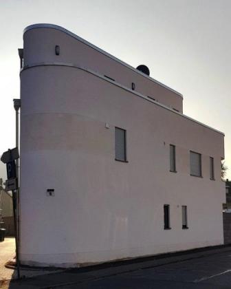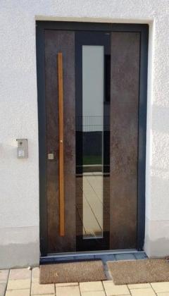 Dieses Haus fällt schon durch seine exponierte, moderne und futuristische Architektur, einem in der Vorderseite abgerundeten Keil, positiv im Ortskern von Pfalzel auf.