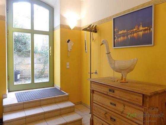 ### Please note the availability date! Bitte das Verfügbarkeitsdatum beachten! ### helle, Souterrain-Wohnung in denkmalgeschützter Stadtvilla in Dresden, Wohnung zum Garten in ruhiger Nebenstraße, separater Eingang am Haus mit eigener überdachter Terrasse; Fußbodenheizung und Fliesenböden; Wohnzimmer mit großer Sitzecke mit Flachbild-TV und funktionstüchtigem Kamin, offene Küche in Seitennische mit Esstisch; Schlafzimmer mit Schrank und zwei Einzelbetten; Eingangsbereich mt Gerderobe und kleinem Schreibtisch; Bad mit Dusche und Waschmaschine, WLAN inklusive, Parken problemlos vor dem Haus; Wichtig: Zwei Labrador-Hunde leben auf dem Grundstück; Pauschalmiete 825,00 Euro bei 1 Person, bei max. 2 Personen 60,00 Euro Aufschlag; Kaution 1.200,00 Euro; Endreinigung Mietersache; Mindestmietdauer 3 Monate; Pflichtangaben zum Energieausweis: Entfällt, Kulturdenkmal gemäß Säschsisches Denkmalschutzgesetz (SächsDSchG)