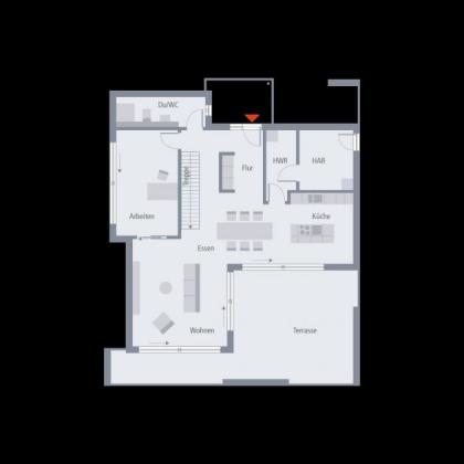 Im hellen Wohnraum, der zugleich das Herzstück des Erdgeschosses ist, führt eine Treppe ins Obergeschoss. Dank des Flachdaches kann dieses ohne Einschränkungen im Hinblick auf die Stockhöhe genutzt werden. Doch das ist nur einer der zahlreichen Vorteile, die in der ersten Etage des Musterhaus Wuppertal zum Tragen kommen. Auf dieser Ebene befinden sich drei Schlafräume - zwei Kinderzimmer und ein Elternzimmer mit sich anschließendem Ankleideraum - ein großes Bad sowie eine separate Toilette. Hier befindet sich aber vor allem das ohne Frage absolute Highlight des Musterhaus Wuppertal: Hier dominiert die über Eck laufende, 58 qm große Dachterrasse, die von allen drei Schlafzimmern direkt zugänglich ist.