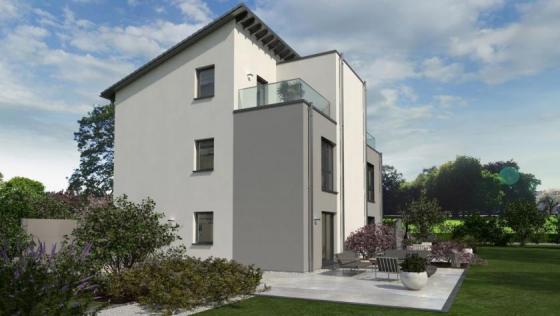 Eine geringe Grundfläche bei maximalem Wohnkomfort - das bietet unser Doppelhaus 08 und eignet sich damit perfekt für kleine Grundstücke. Das dreigeschossige Gebäude mit Pultdach überzeugt nicht nur durch sein durchdachtes Raumkonzept, sondern auch mit einer außergewöhnlichen Architektur, die sich bereits in der Fassadengestaltung zeigt: Durch die symmetrische Bauweise mit einem erkerartigen Vorsprung, der die beiden baugleichen Wohneinheiten optisch voneinander trennt, entstehen im zweiten Obergeschoss sichtgeschützte Balkone, die nach einem anstrengenden Tag zum Relaxen einladen. Ein Ort zum Zusammenkommen, Kochen, Austauschen und Genießen ist das Erdgeschoss mit offenem Wohn-Ess-Koch-Bereich. Zudem im Parterre: HAR, HWR und Gäste-WC. Das erste Obergeschoss ist zugleich das Reich der Kinder: Zwei Zimmer und ein großes Bad stehen hier zur Verfügung. Unter dem Pultdach haben die Eltern ihren Rückzugsort - mit Schlaf- und Arbeitszimmer und direktem Zugang zum Balkon. Mehr Wohnen geht nicht.
