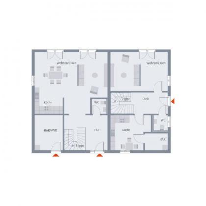 Erst auf den zweiten Blick erkennt man, dass unter dem Satteldach gleich zwei Häuser stecken. Mit unterschiedlichen Grundrissen und Größen entspricht die Planung nicht dem klassischen Doppelhaus. Während die eine Hälfte Raum für eine Familie mit bis zu zwei Kindern bietet, fühlen sich im etwas kleineren Haus Singles, Paare oder Familien mit nur einem Kind wohl. Ob Familienmitglieder mit einziehen oder fremdvermietet wird, entscheidet der Bauherr. Jedes Haus hat seinen eigenen Hauswirtschaftsraum. So wirtschaftet jeder autonom. Alle Räume überzeugen im typischen OKAL-Stil mit hohem Komfort, Großzügigkeit und viel Lichteinfall.