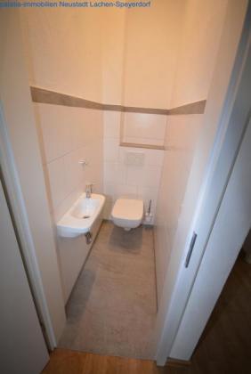 Das Gäste-WC ist modern gestaltet und hat eine angenehme Größe. Der sanierte, geräumige Badbereich verfügt über eine Badewanne, WC, Waschbecken und eine begehbare, bodenebene Dusche.