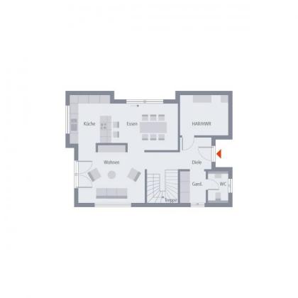 Ein wahrer Blickfang ist unser Black Label 9, bei dem vier rechteckige, unterschiedlich hohe Elemente harmonisch zu einem Gesamtbild verschmelzen. Diese besondere Architektur verleiht der Fassade nicht nur ein außergewöhnliches Erscheinungsbild, sondern sorgt auch im Inneren des über 145 m² großen Einfamilienhauses für zahlreiche wohnliche und visuelle Highlights. Der überdachte Eingangsbereich führt direkt in den hellen und offen gestalteten Wohn-Ess-Koch-Bereich, wo Versätze eine besondere Wohlfühlatmosphäre schaffen. Im vorderen Bereich, abgetrennt durch die Treppe ins Obergeschoss, befinden sich der Hauswirtschaftsraum, die Garderobe und das Gäste-WC. Ein Highlight der ersten Etage ist der fast 10 m² große Balkon, der sowohl vom Tageslichtbad als auch vom Elternschlafzimmer aus zugänglich ist. Das Raumangebot wird durch zwei Kinderzimmer ergänzt, die beide über ein großzügiges Sitzfenster verfügen und somit einen ganz besonderen Lieblingsplatz bieten.