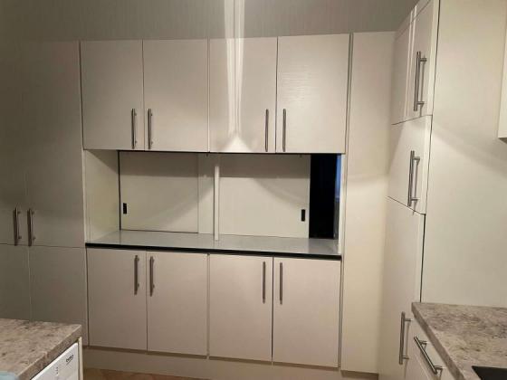 Die große Einbauküche ist modern und bietet jede Menge Stauraum. Einbaugeräte, wie Herd mit Cerankochfeld, Dunstabzugshaube, Geschirrspüler sowie Kühl- Gefrierkombination machen die Küche vollständig. Es ist auch eine praktische Durchreiche zum Essbereich im Wohnzimmer vorhanden.