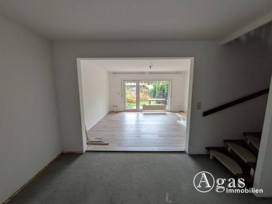 Geradeaus führt der Flur weiter direkt in das Herzstück des Hauses. Hier erwartet Sie ein großzügiges Wohnzimmer, das durch seine helle und einladende Atmosphäre besticht. Von hier aus gelangen Sie auf die Terrasse und in den kleinen Garten, die an warmen Tagen zu erholsamen Stunden im Freien einladen.