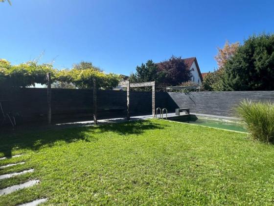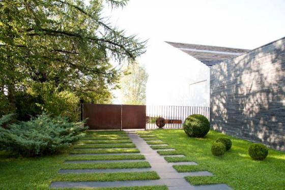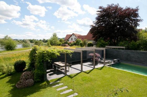 Auf der Südseite des Gebäudes gibt es einen fließenden Übergang vom Biotop über den Garten zum Schlafbereich. 50% des Gartens sind als Atriumgarten ausgeführt, der die Einsicht vom Wanderweg und der Loipe auf diesen Teil des Gartens verhindert. Hinter der Natursteinwand befindet sich der Pool, das Sonnendeck und die überwachsene Loggia.