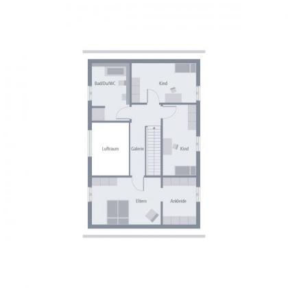 Offenheit, Helligkeit und Großzügigkeit - dadurch zeichnet sich unser Design 28 aus. Vor allem der große Wohn-Ess-Koch-Bereich, der direkt über die Diele betreten werden kann, wird durch die zahlreichen Fensterfronten und den großzügigen Schnitt zu einem Lieblingsort für Familie und Freunde. Das Raumangebot Parterre wird abgerundet durch einen Hauswirtschaftsraum, Gäste-WC mit Dusche sowie ein Arbeits- bzw. Gästezimmer. Ein weiteres Highlight: die Treppe, die in den Wohnbereich integriert ist und von hier in die Privat- und Rückzugsräume der Familie führt. Über die lichte Galerie geht es direkt in die beiden Kinderschlafzimmer und das große Badezimmer mit Dusche, Wanne und WC. Auf der Rückseite der Treppe: das Reich der Eltern. Diese verfügen über ein großes Schlaf- und ein sich direkt anschließendes Ankleidezimmer. Auf einer Fläche von rund 158 m² finden Familien hier unter einem zeitlos-eleganten Satteldach alles, was das Herz begehrt.