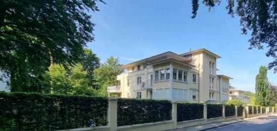 Im Herzen des traditionsreichen Seebads Heringsdorf, nur wenige Schritte von der Ostseestrand-Promenade entfernt, liegt die Villa Charlotte – eingebettet in ein großzügiges, parkähnliches Grundstück, das gemeinsam mit einer zweiten Villa eine exklusive Eigentümergemeinschaft mit nur 24 Wohnungen bildet. Die Lage könnte kaum besser sein: zentral und dennoch herrlich ruhig, mit direktem Blick in den angrenzenden Goethepark und nur etwa 150 Meter vom feinen, weißen Sandstrand entfernt.