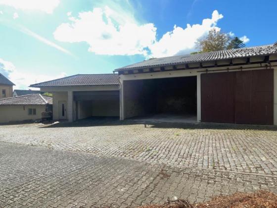 Kleiner Werkstatt, Doppelgarage, offener Car-Port, Geräte-Garage mit Roll-Tor und dem Zugang zum Kelterhaus in der Scheune.