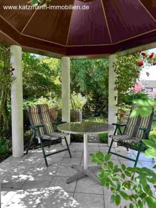 Auch der überdachte Pavillon - im hinteren Bereich des Gartens - lädt zum Sitzen und Entspannen ein.