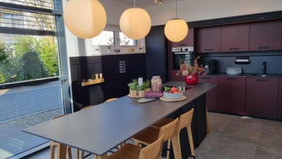 Die zweigeschossige Stadtvilla mit Zeltdach und Erker-Anbau präsentiert sich in schnörkellosem Design. Eyecatcher hier: die 5 Meter hohe Eck-Glasfront. Das Wohnkonzept steht für Offenheit und Transparenz und gewährt gleichzeitig ausreichend Privatsphäre.