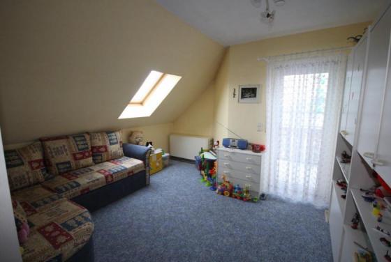 Das Obergeschoss beherbergt zwei Kinderzimmer, wovon jedes einen Zugang zum Balkon hat und das elterlichen Schlafzimmer.