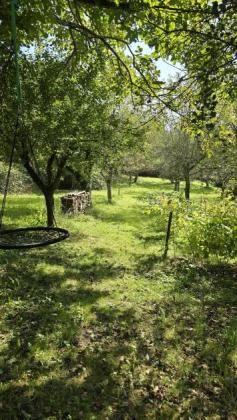 Eine abschließbare Gartenlaube mit Regenwassertank, Sitzbank und Schaukel stehen für Freizeitaktivitäten zur Verfügung.