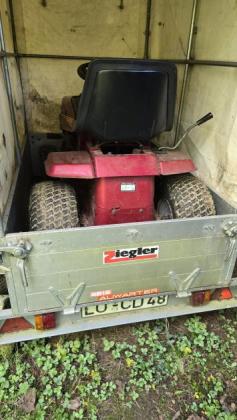 In einem nicht mehr zugelassenen Anhänger ist der Sitzrasenmäher untergebracht zur Rasenpflege..