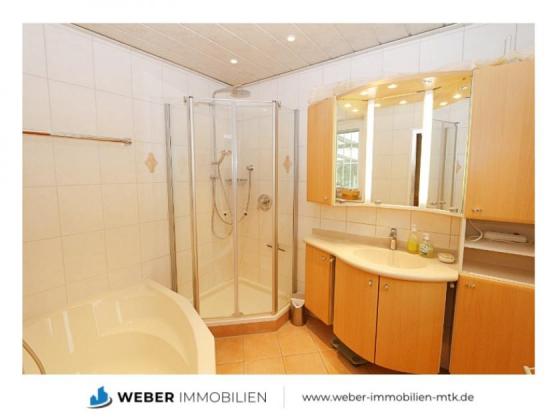 Auf dieser Etage befindet sich ferner das mediterran geflieste Tageslicht-Badezimmer. Es verfügt über eine Eck-Dusche und eine Badewanne sowie einen großen Waschtisch mit Unterschrank, Spiegelschrank und seitlichen Schränken. Das WC befindet in einem separaten Raum und verfügt ebenfalls über ein Fenster.