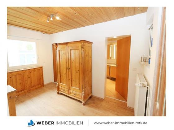 Im 1. OG befinden sich 1 schönes Schlafzimmer und das oben beschriebene zweite Zimmer als Durchgangszimmer zum Dachgeschoss - beide Räume sind mit neuem Laminat in Eiche belegt. Das Schlafzimmer auf dieser Etage entspricht in Größe dem Wohnzimmer im Erdgeschoss.