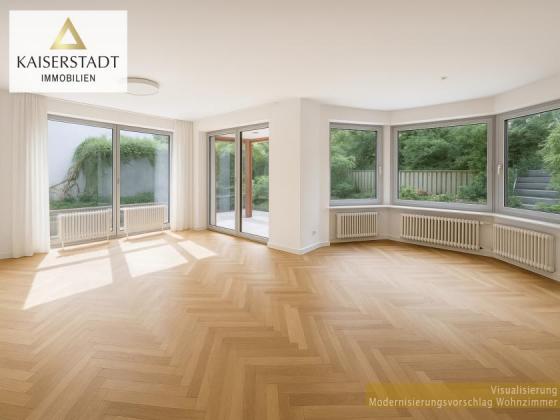 Mit einer Wohnfläche von ca. 95 m² bietet die Wohnung ein durchdachtes Raumkonzept, das sowohl Komfort als auch vielseitige Nutzungsmöglichkeiten vereint. Das Herzstück der Immobilie ist das beeindruckende Wohn- und Esszimmer mit rund 40 m² Wohnfläche, das mit einer großflächigen Fensterfront viel Licht ins Innere lässt und den direkten Zugang zur Terrasse und dem idyllischen Garten ermöglicht. Zwei weitere Zimmer – ideal als Schlafzimmer, Kinderzimmer oder Büro nutzbar – bieten zusätzlichen Raum zum Leben und Entspannen. Die separate Küche sowie ein Badezimmer mit Badewanne und ein zusätzliches Gäste-WC komplettieren das Raumangebot.