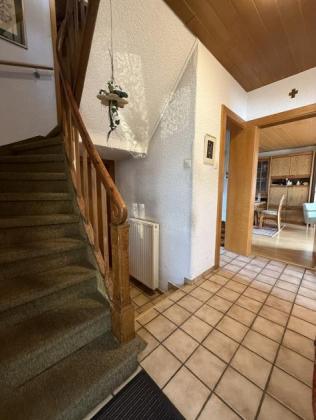 Die Bodenbeläge im Erdgeschoss bestehen aus Fliesen und Laminat, im Dachgeschoss überwiegend aus Teppichboden.