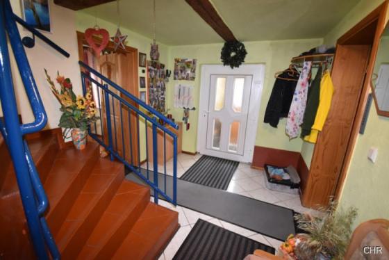 Durch einen kleinen Windfang kommt man direkt in die Diele des Hauses. Hier befindet sich auch die Treppe in das Dachgeschoss, sowie ein Anschluss für einen Kaminofen. Bis letzten Winter wurde hier zusätzlich mit Holz geheizt und sorgte im ganzen Erdgeschoss für eine gemütliche Wärme.