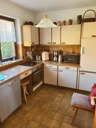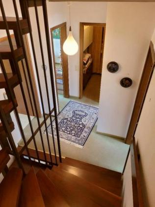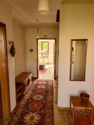 Küche mit Tageslicht-Einbauküche, 4 Schlafzimmer, Wohn-/Esszimmer, 2 Tageslicht-Bäder, teilweise Holzdecken im Dachgeschoss, Rolläden teilweise elektrisch, Holztreppen, ausgebauter Dachboden und Keller. Zugang zum Keller auch über eine Aussentreppe. Teilüberdachte Terrasse mit Markise, Garage ca. 25 m vom Haus entfernt. Fussböden: Teppich, Fliesen. Vorgarten, Geräteschuppen, Holzfenster, Viessmann-Gasheizung von 2021, Sat-TV-Empfang.