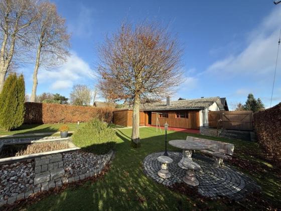 Das insgesamt ca. 1.456 m² große Grundstück ist nach Westen ausgerichtet und sehr großzügig geschnitten. Es gliedert sich in einen Vorgarten mit Zufahrt, den Hofbereich hinter dem Haus mit den Garagen- und Werkstattgebäuden, einen anschließenden Garten mit großem Gartenhaus sowie eine dahinterliegende Wiese. Diese Fläche eignet sich beispielsweise auch als Hauswiese für ein Pony oder für andere tierbezogene oder naturnahe Nutzungen.
