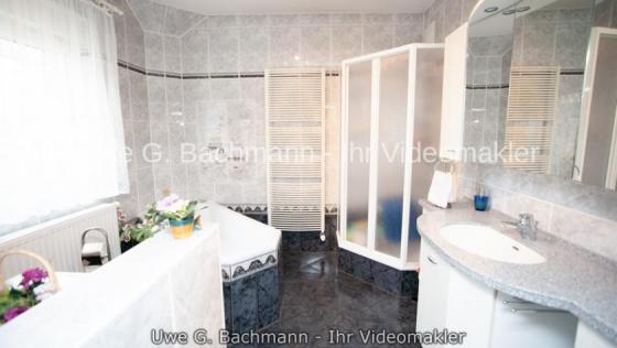 Das Wannenbad mit separater Dusche wurde deckenhoch gefliest. Auch die freistehende Badewanne wurde ein gefliest und verfügt über praktische Ablagemöglichkeiten. Zur Trocknung von Handtüchern kann ein Handtuchheizkörper genutzt werden. Ein Waschmaschinenanschluss ist ebenso vorhanden.