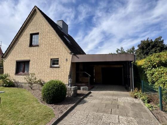 Dieses gepflegte Einfamilienhaus präsentiert sich in solider Bauweise mit gelbem Klinker, klassischer Pfanneneindeckung und charmanten Sprossenfenstern. Auf dem großzügigen Grundstück stehen Ihnen zudem eine Garage, ein Carport sowie ein zusätzlicher Stellplatz zur Verfügung. Eine sonnige Terrasse lädt zum Verweilen im Freien ein.