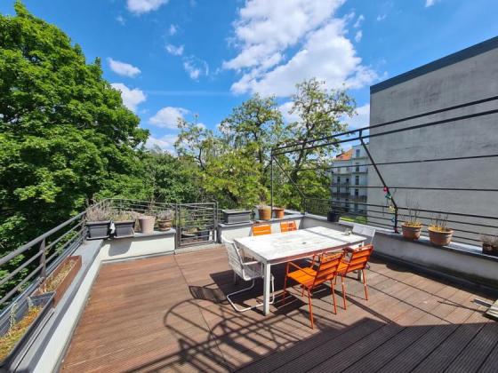 Die Bebauung setzt sich zusammen aus einem hochwertigen, gut belichtetem Seitenflügel-Neubau von 2008 mit Balkonen und Dachterrasse und einem ebenfalls gut belichteten gründerzeitlichen Altbau mit Quergebäude, Seitenflügel und zwei Dachterrassen am Park. Da Alt- und Neubau jeweils auf einem eigenen Flurstück liegen, ist eine separate Verwendung und Eigentümerschaft möglich.