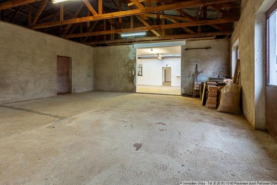 Die Halle ist über einen 2,67 m breiten Durchgang von der ehem. Werkstatt aus erreichbar sowie über einen Durchgang (Türbreite) der davorliegenden Garage.