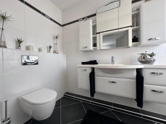 Bis auf das Dachstudio (hochwertiges Laminat) sind alle Räume mit hochwertigen Fliesen und Fußbodenheizung ausgestattet. Es gibt ein Gäste-WC im Erdgeschoss sowie ein großes Familienbad im Obergeschoss mit moderner Dusche, freistehender Badewanne, zwei Waschtischen, WC und Bidet.
