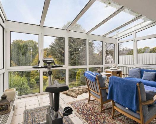 Das Erdgeschoss ist aufgeteilt in ein Wohnzimmer mit angrenzendem Essbereich, ein Schlafzimmer, ein Tageslichtbad und eine Küche mit Zugang zu einem beheizten Wintergarten.